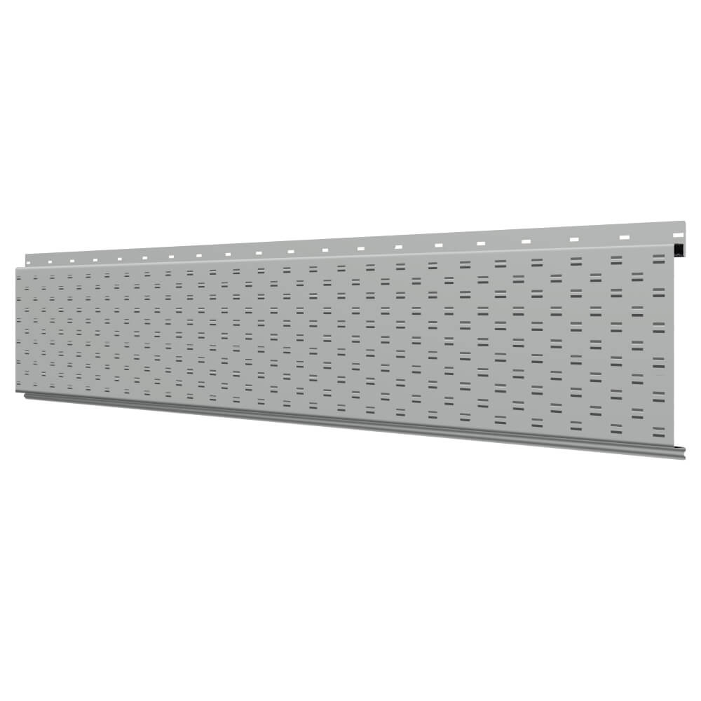 Линеарная потолочно-стеновая панель с ПЕРФОРАЦИЕЙ для вентиляции цвет RAL9006 Серебро применяется в качестве софитов для подшивы крыши, наружной и внутренней отделки потолков, стен, фронтонов фасада дома в Кургане.