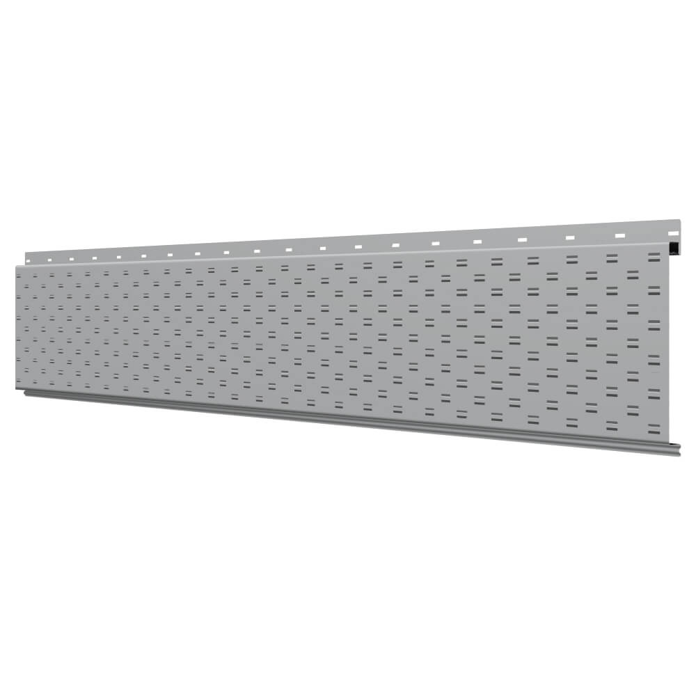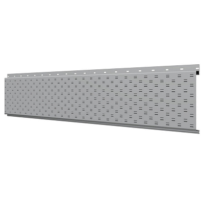 Линеарная потолочно-стеновая панель с ПЕРФОРАЦИЕЙ для вентиляции цвет RAL7004 Серый применяется в качестве софитов для подшивы крыши, наружной и внутренней отделки потолков, стен, фронтонов фасада дома в Кургане.