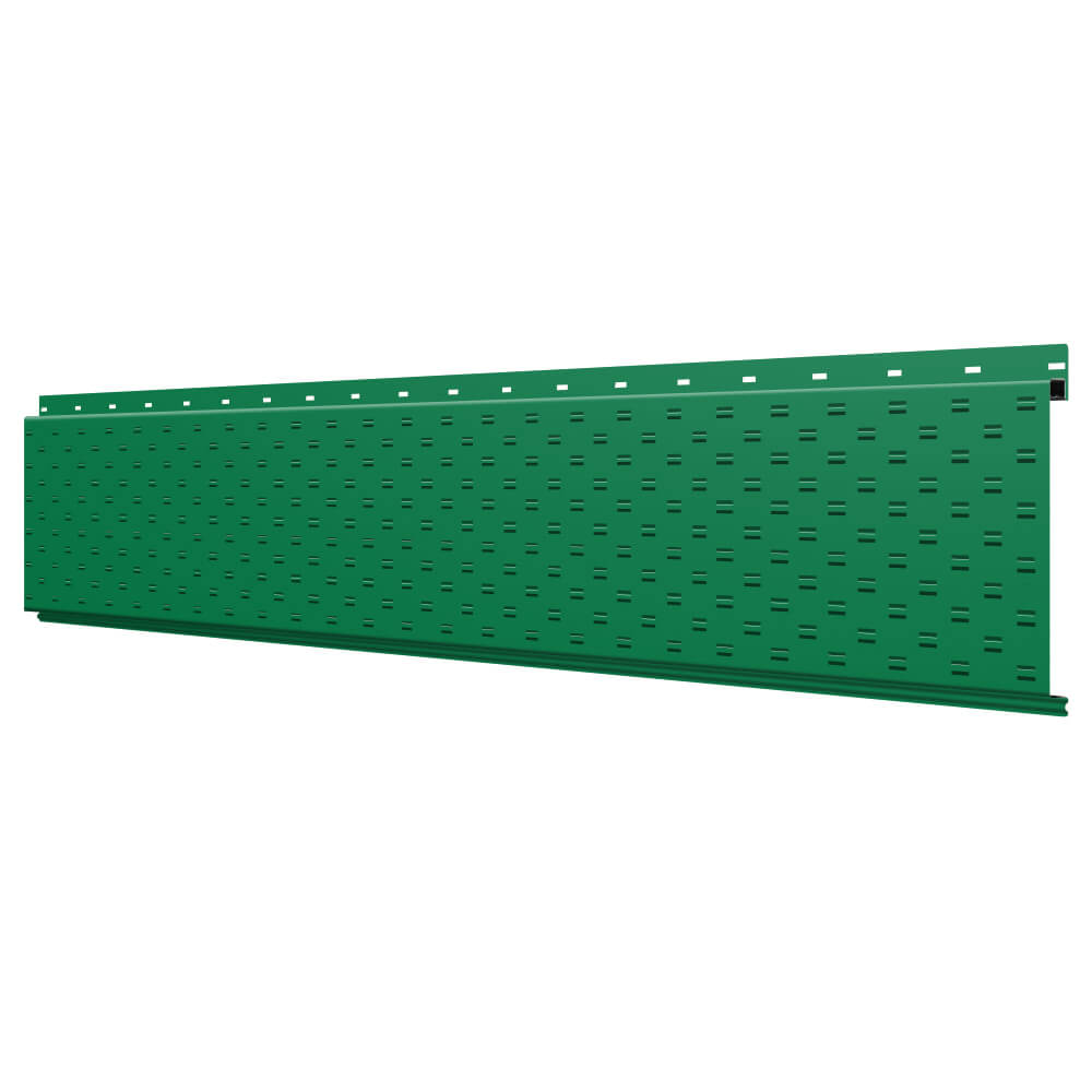 Линеарная потолочно-стеновая панель с ПЕРФОРАЦИЕЙ для вентиляции цвет RAL6029 Зеленая Мята применяется в качестве софитов для подшивы крыши, наружной и внутренней отделки потолков, стен, фронтонов фасада дома в Кургане.