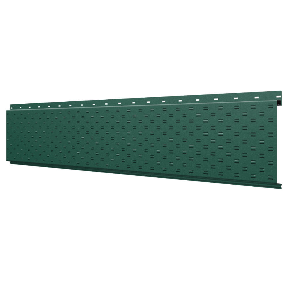 Линеарная потолочно-стеновая панель с ПЕРФОРАЦИЕЙ для вентиляции цвет RAL6005 Зеленый Мох Стальной Бархат применяется в качестве софитов для подшивы крыши, наружной и внутренней отделки потолков, стен, фронтонов фасада дома в Кургане.