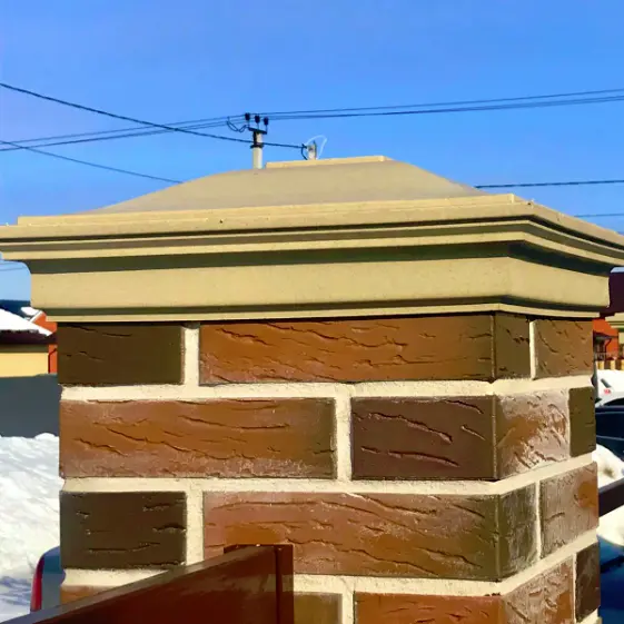 Колпаки Monblan (Монблан) из полимерпесчаного композита в бежевом цвете установлены на кирпичных столбах забора. Служат надёжной защитой кладки от воздействия осадков, одновременно придавая конструкции завершённый и эстетичный вид. Бежевый оттенок гармонично сочетается с кирпичом и общей архитектурой участка, подчеркивая аккуратность и долговечность ограждения.