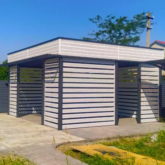 Стильная беседка-пергола, выполненная из металлопланкена под дерево Беленый дуб Printech (Корея). Конструкция сочетает в себе прочность металлического каркаса и эстетичность древесной текстуры, благодаря чему выглядит современно и гармонично вписывается в ландшафт. Светлый оттенок покрытия добавляет лёгкости, создаёт атмосферу уюта и при этом обеспечивает долговечность и устойчивость к внешним воздействиям. Отличный вариант для организации комфортной зоны отдыха на участке.